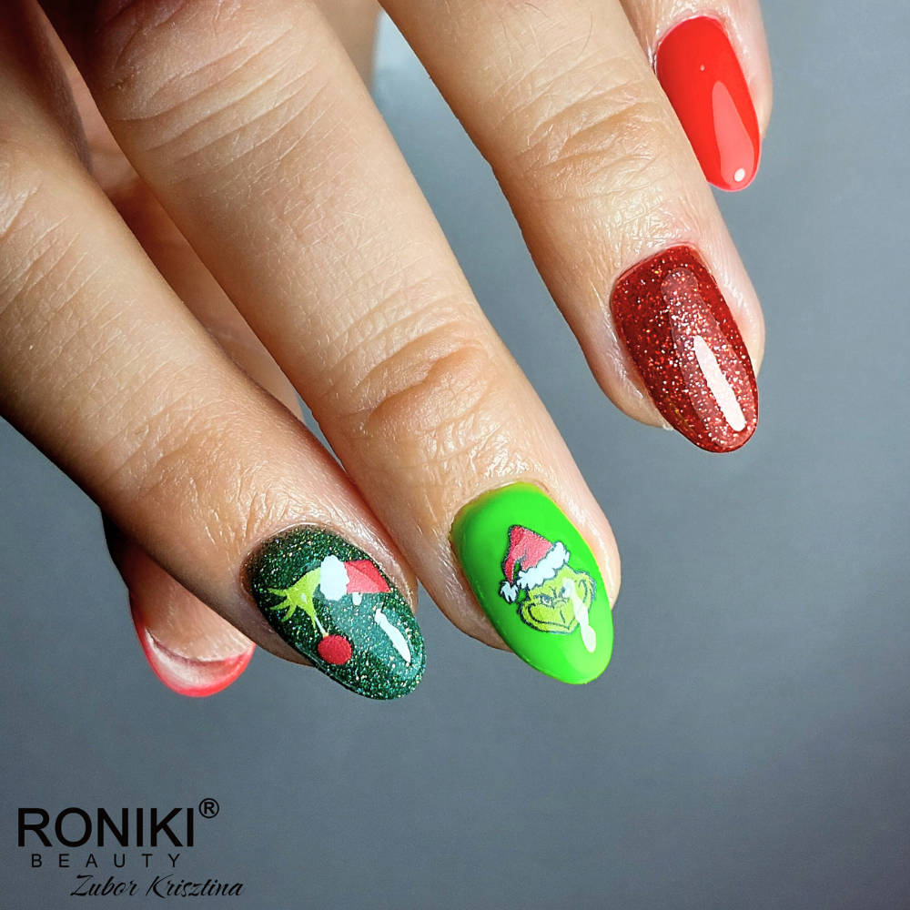 A karácsonyi időszak egyik legkülönlegesebb és legmerészebb körömtrendje a Grincs inspirálta körmök, amelyeket a zöld-piros színkombináció tesz igazán ünnepivé. Ezen körmök megalkotásakor a zöld szín a Grincs ikonikus bőrszínét idézi, míg a piros a karácsonyi ünnepek elengedhetetlen színe. Ez a színkombináció nemcsak a Grincs karakterének sajátosságait tükrözi, hanem a karácsonyi dekorációk világát is megidézi. A csillogó Grincs körmök tökéletesen illeszkednek a karácsonyi hangulathoz, hiszen a csillogás és fényesség az ünnepi időszak elengedhetetlen elemei. A zöld és piros körmök a Grincs inspirálta stílusban nemcsak a karácsony színeit hordozzák, hanem egyfajta kreatív kifejezésmódot is jelentenek, amely az ünnepi hangulatot még inkább fokozza. Az ünnepi Grincs körmök különleges csillogó elemekkel való díszítése pedig tovább növeli a körmök látványosságát és ünnepi jellegét. A karácsonyi Grincs körmök kreatív dizájnja és színei lehetőséget adnak arra, hogy a hagyományos ünnepi megjelenést egy kis csavarral fűszerezzük meg, így téve azt egyedivé és emlékezetessé.